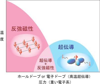 最近我々の核磁気共鳴を用いた研究を通じて、図に示されているように、「反強磁性体」が 圧力や電荷ドーピングによって両者の共存領域を経て「超伝導」へと連続的に変化していくことが明らかになってきました。特に銅酸化物で超伝導転移温度がこれまでのものより5倍 近く高くなっている理由は、「磁性」が絡んだ「強相関効果」に起因するものであると考えられます。このような「磁性」と「超伝導」の連携・協奏は、強相関電子系の超伝導体 全般で見られることもわかってきました。